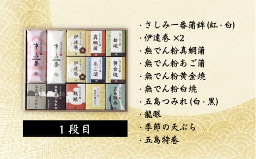 さしみ一番蒲鉾(紅・白)、こんまか蒲鉾(伊達巻×2、無でん粉真鯛蒲、無でん粉あご蒲、無でん粉黄金焼、無でん粉白焼、五島つみれ(白・黒)、龍眼、季節の天ぷら、五島特巻)