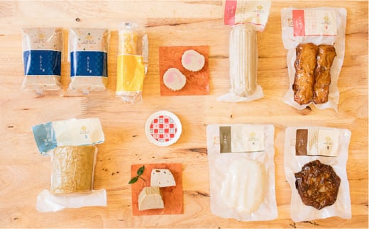かまぼこ8点(えそ天(1枚)、 いわしバーグ(1枚)、 ピリ辛いかゲソ(2本)、 あご刺身蒲鉾(1本)、 えそちくわ(1本)、 島すりみ鯵(180g)×2、あじ巻かまぼこ(1本))