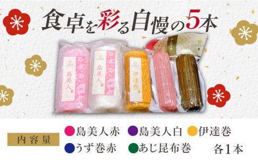 伊達巻、島美人赤、島美人白、あじ昆布巻、うず巻赤 各1本