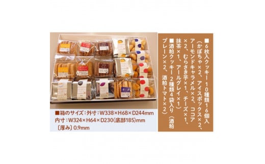 ・内容量:6枚入クッキー 10種類16個入(かぼちゃ、アイスボックス、アーモンドキャラメル、ココア、むらさき芋、チーズ、抹茶、アールグレイ、酒粕プレーン、酒粕トマト)