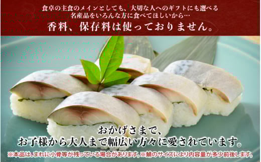 肉厚鯖がたまらない! 「〆鯖寿司」 1本 約290g ~家族が喜ぶ手土産~【名物 ジューシー サバ しめ鯖 押し寿司 バッテラ すし こしひかり 贈答 ギフト お土産 大人気】 [A-0531]