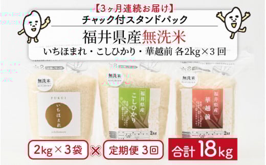 【令和7年産・新米】 定期便 ≪3ヶ月連続お届け≫ 福井産無洗米 いちほまれ こしひかり 華越前 各2kg × 3回 計18kg 【 無洗米 人気 品種 ブランド米 特A 】 [I-6104]