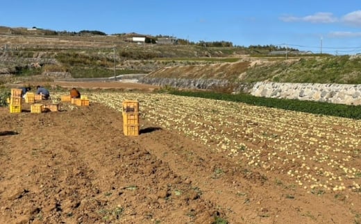 橘湾の潮風が育てる: 飯盛地区の畑は、橘湾に面した標高130mほどの高台に広がる段々畑。ここには、海からミネラルを含んだ温暖な潮風が一年を通して吹き込みます。この潮風のおかげで遅霜の被害を受けにくく、じゃがいもはストレスなく、のびのびと甘みを蓄えながら育ちます。