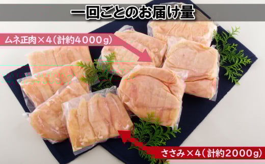 B325b【鶏肉むね・ささみセット 3回定期便】ながさき福とり 鶏肉正肉セット (計6,000g) 総計18kg【長崎福鳥】小分け 真空冷凍 冷凍 定期便 むね ムネ ささみ ササミ ハーブの力で健康に育てたブランド鶏