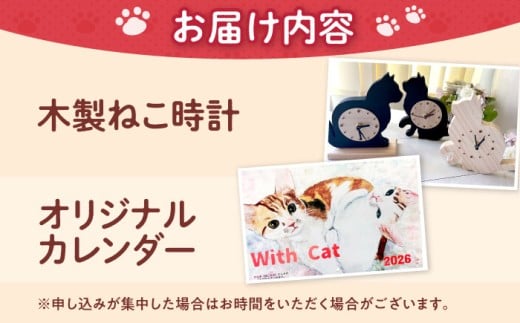 ねこ雑貨セット 木製ねこ時計&WithCatオリジナルカレンダー 猫 保護猫 猫グッズ おもちゃ 保護猫支援 ネコ 雑貨 大阪府高槻市/WithCat [AOEI005]
