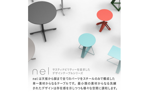 nelは天板から脚まで全てのパーツをスチールのみで構成した単一素材からなるテーブルです。