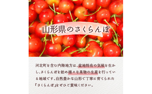 さくらんぼの名産地・山形県にある河北町で育った、大粒L玉以上の美味しいさくらんぼを500g、パック入りでお届けいたします!