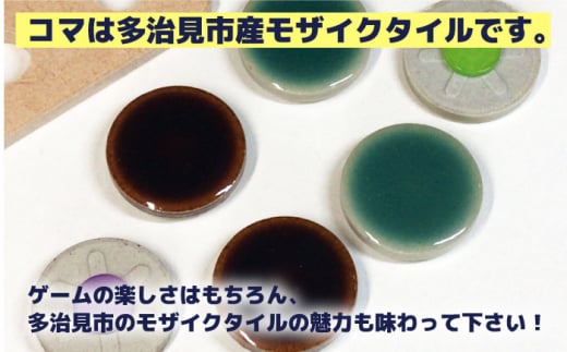 ゲームに使われているコマには、多治見市の特産品である美濃焼タイル(モザイクタイル)を使っています。ゲーム盤とパッケージも多治見市内のメーカーで製作されています。