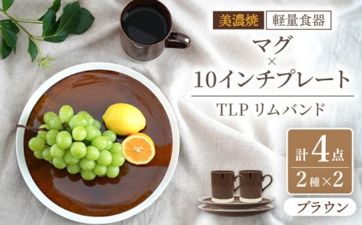 7. 【美濃焼】[軽量食器] TLPリムバンド ブラウン マグ×2個 10インチプレート×2枚 ペアセット【井澤コーポレーション】 [TBP121]