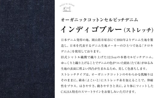 生地:オーガニックコットンセルビッチデニム/インディゴブルー/Cotton 98% / Pu 2% (クロキデニム)