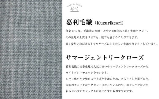 葛利毛織の定番生地で人気の高いサマージェントリークローズから、ライトグレーチェックをセレクト。