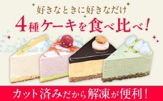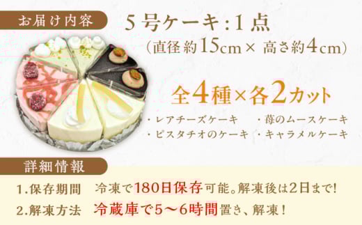 全4種、各種2カット:レアチーズケーキ60g、ピスタチオのケーキ40g、苺のムースケーキ40g、キャラメルケーキ40g