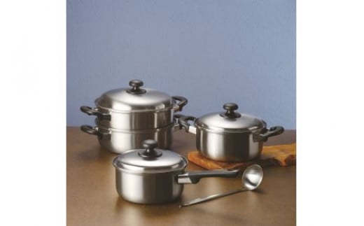 片手鍋18cm(約2.4L)・両手鍋20cm(約3.1L)・パスタポット22cm(約5.4L)二段蒸し器24cm(下鍋:約4.0L)・お玉 各1