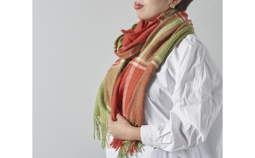 ベビーアルパカ手織りストール(グリーン、オレンジ、白の格子柄)・白缶 FCCS050017