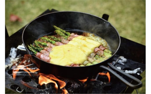 炒め物はもちろんの事、付属のフタを使用しロースト・揚げ物・煮物・ピザまでもこなしてしまう万能なスキレット。従来のスキレットより立ち上がりが高いので、食材がこぼれにくく調理しやすい設計。アウトドアではもちろん、ご家庭でも活躍する黒皮スキレットです。