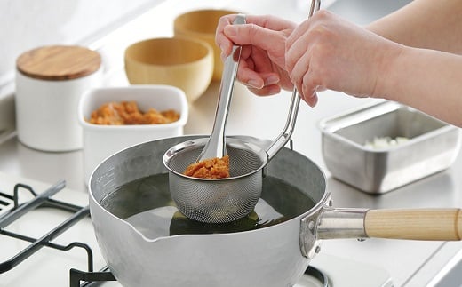 サイズ:だしとりあみ/幅16×全長32.5×高さ6.5cm、味噌こし/幅9.8×奥行13.5×高さ22cm、スプーン/幅4×全長19.5×高さ3cm