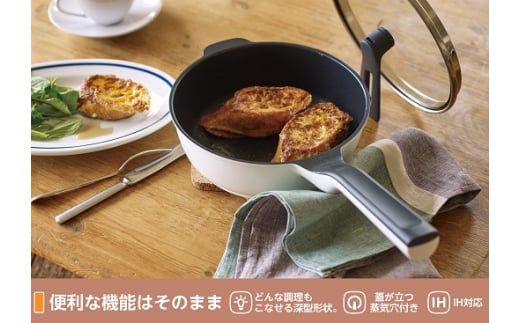 材質:本体:アルミニウム合金、内面:アルマイト、フッ素樹脂塗膜加工、外面:アルマイト、焼付塗装、底面:鉄溶射加工(プラス・ミニ/板厚3.5mm、ワイド/3.8㎜、エッグ/板厚4.0㎜)、蓋:全面物理強化ガラス(エッグ用リング部:シリコーンゴム)