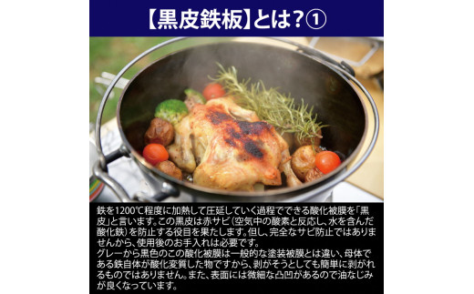 お手入れ簡単な黒皮鉄板。油なじみが良く、金タワシを使う事も可能です。