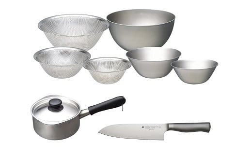 7. キッチンナイフ18cm & ステンレス製ミルクパン14cm (蓋付き) & ボウル・パンチング6点 セット FC060037