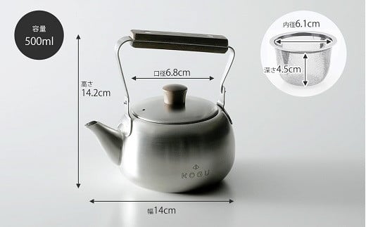 持ちやすく、注ぎやすい木製ハンドル。傾けやすいハンドル角度にしました。落としても割れないステンレス製。2~3人分が入れられるサイズ。ストレーナー付で茶葉を捨てるのもラクラク。ツマミは熱くならない木製。