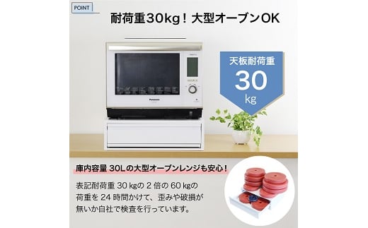 天板の耐荷重30kgとしっかり仕様。表示耐荷重の2倍60kgの荷重で検査済です。天板サイズは約幅50×奥行40cm、大型のオーブンレンジにも対応します。