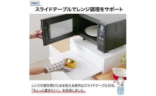 スライド棚はレンジの扉が干渉しないよう、引き出し収納の下に配置。高さの低い食器・食材を置いたまま、レンジの扉を開閉でき、食材の一時置き棚としての、使いやすさにこだわりました。