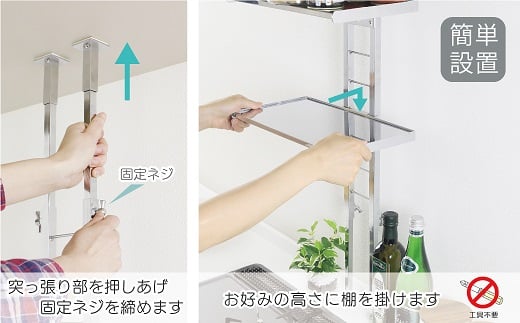 壁に穴を開けることなく、コンロ脇やシンク上などの欲しい場所に棚を設置できます。