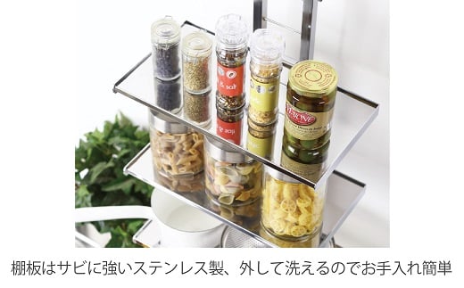 ステンレス製の棚は、1段あたり耐荷重3.5kg。調味料やキッチン小物を置いたり、料理中のボウルを一時置きしたりと色々なシーンで活躍します。