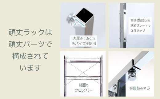 ※約19mmの丈夫な角パイプフレーム、上下フレームの連結補強プレート、背面クロス補強など頑丈構造。