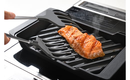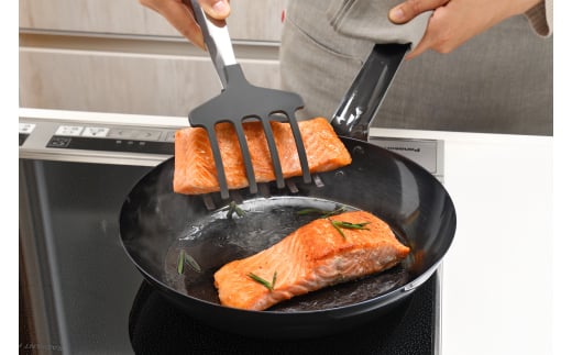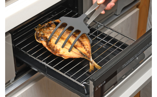 焼魚、煮魚、崩さずしっかりキャッチ。菜箸で大きなお魚をつかむと崩れやすく、ひっくり返すのも大変。「おさかなキャッチャー」は幅広く、お魚をしっかりつかめる形状のトングです。幅が広い形状なのでサンマやアジの開きなどをひっくり返したり、盛り付けたりがラクラクです。菜箸では崩れやすい煮魚もしっかりキャッチ。片手で簡単にロック。スタンド付きなので調理中、置き場に困らない。