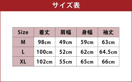 Lサイズ:着丈100cm、肩幅52cm、身幅62cm、袖丈64.5cm