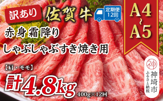 【12か月定期便】訳あり!【A4~A5】佐賀牛赤身霜降りしゃぶしゃぶすき焼き用(肩・モモ) 400g×12回【肉 牛肉 ブランド牛 黒毛和牛 ふるさと納税】(H112228)