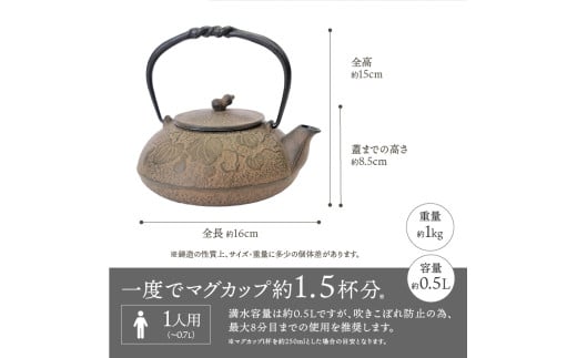 茶こしが付属するため、急須としても使用可能な小ぶりの鉄瓶です。