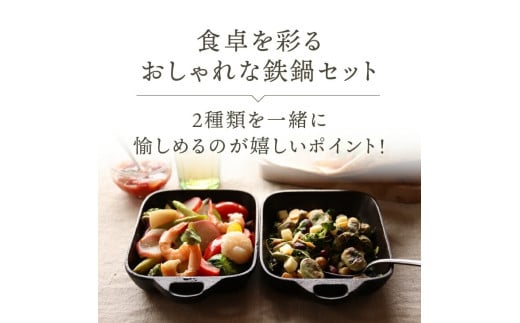 浅型の鍋本体が2個セットになった、小さめの鉄鍋です。