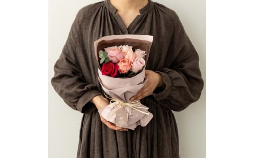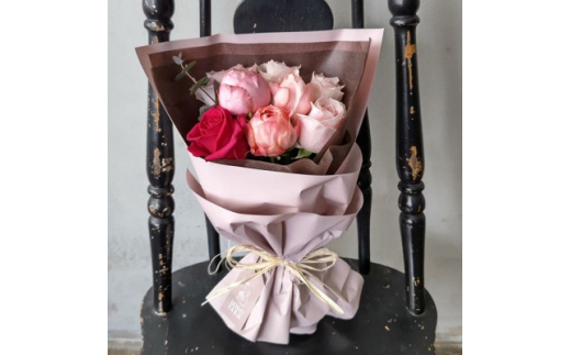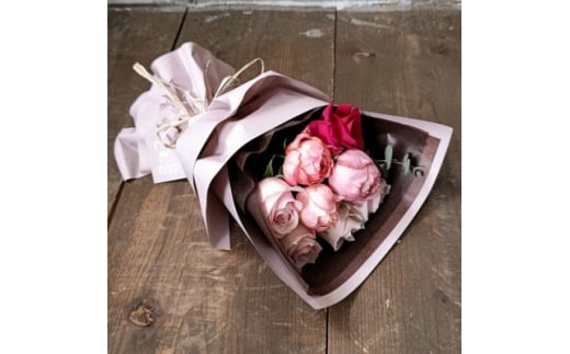 栽培しているピンク系の品種の中より、その時一番のおすすめのバラを摘み取りキュートなピンク系のブーケに仕立てます。