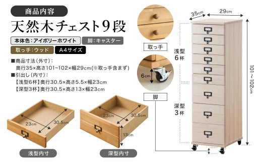 天然木チェスト 9段 A4サイズ アイボリーホワイト・キャスター・取っ手D(ウッド) 書類 引き出し