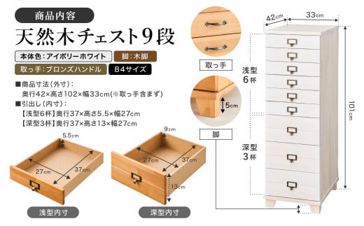 天然木チェスト 9段 B4サイズ アイボリーホワイト・木脚・取っ手C(ブロンズハンドル) 書類 引き出し