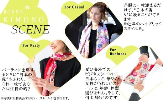 ROSHA-KIMONO / 絽紗キモノ は、生地もデザインも 着物から生まれた“持ち歩けるきもの”ストールのラインです。