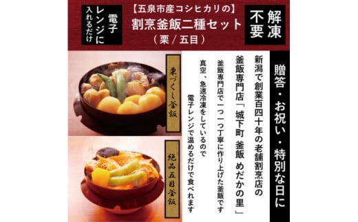釜飯 老舗割烹仕込みの釜飯 2種セット 各1個 ( 栗 / 五目 ) レンジで簡単調理 コシヒカリ使用 | 釜飯セット 釜めし かまめし 冷凍 新潟県 五泉市 株式会社松の家