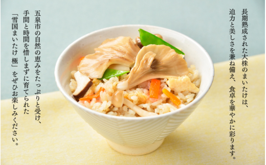 五泉市の自然の恵みをたっぷりと受け、手間と時間を惜しまず育てられた「雪国まいたけ極」を是非お楽しみください。