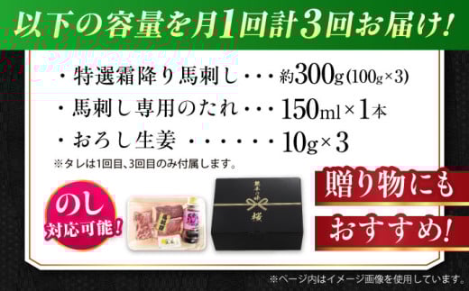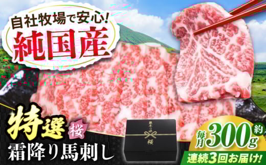 【全3回定期便】『純国産』熊本の味「桜」霜降り馬刺し「特選」 計約900g(約300g×3回) 霜降り 馬肉 馬刺【有限会社 九州食肉産業】 馬刺し 馬肉 桜肉 馬 うま ウマ ヘルシー 国産 新鮮 専用タレ 霜降り 上質 小分け セット 低カロリー 高タンパク 冷凍 生食 生肉 産地 部位 専用醤油付 専用 醤油 専用タレ付 タレ ギフト 贈答用 食品 合志 合志市 [AYCN012]