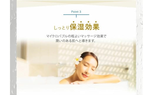 優れた洗浄効果、やさしい温浴効果、しっとり保湿効果、約40%の節水効果があります