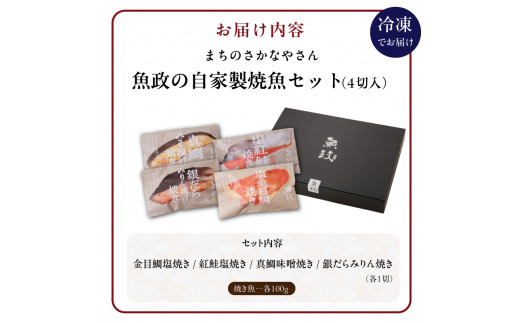 まちのさかなやさん魚政の自家製焼魚セット4切入(真鯛味噌焼き100g・金目鯛塩焼100g・銀だらみりん焼100g・紅鮭塩焼100g)_Cs309