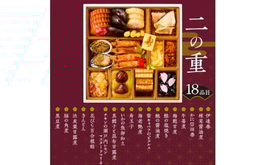 伊達巻・椎茸醤油煮・かに信田巻・牛蒡煮・梅麩甘煮・鮭の塩焼き・鮑の醤油煮・紫キャベツのピクルス・海老艶煮・寿玉子・いかの魚卵和え・真鱈子と昆布甘露煮・チキンの瀬戸内レモンマスタードマリネ・花びら百合根餡・きんとん・渋皮栗甘露煮・豚の角煮・黒豆煮