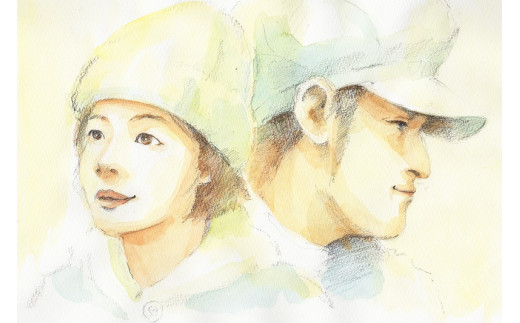 実際に水彩画を手描きし、デジタル処理後印刷しますので、柔らかい透明水彩のタッチが生きた似顔絵です。