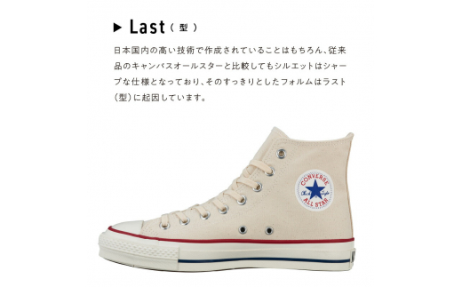 【ラスト(型)】特徴としては、日本国内の高い技術で作成されていることはもちろん従来品のキャンバスオールスターと比較してもシルエットはシャープな仕様となっており、そのすっきりとしたフォルムはラスト(型)に起因しています。