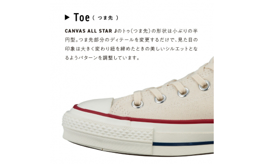 【トゥ(つま先)】シルエットと同じくわかりやすい特徴はトゥ(つま先)の形状です。CANVAS ALL STAR Jのトゥは小ぶりの半円型。つま先部分のディテールを変更するだけで、見た目の印象は大きく変わり紐を締めたときの美しいシルエットとなるようパターンを調整しています。
