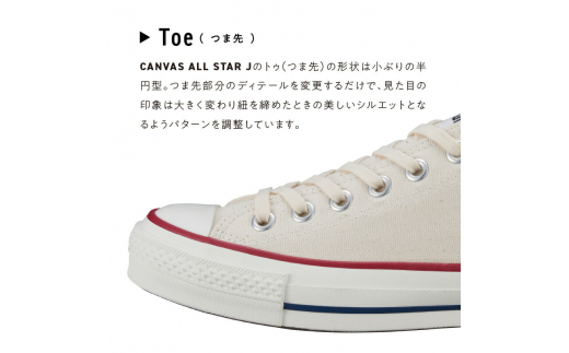 【トゥ(つま先)】シルエットと同じくわかりやすい特徴はトゥ(つま先)の形状です。CANVAS ALL STAR Jのトゥは小ぶりの半円型。つま先部分のディテールを変更するだけで、見た目の印象は大きく変わり紐を締めたときの美しいシルエットとなるようパターンを調整しています。