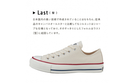 【ラスト(型)】特徴としては、日本国内の高い技術で作成されていることはもちろん従来品のキャンバスオールスターと比較してもシルエットはシャープな仕様となっており、そのすっきりとしたフォルムはラスト(型)に起因しています。