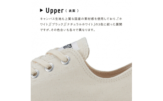 【アッパー(表面)】ラスト以外としては、アッパーに用いられているキャンバス生地も上質な国産の素材感を使用しており、「ホワイト」「ブラック」「ナチュラルホワイト」の3色に絞った展開ですが、その色合いも各々で異なります。
